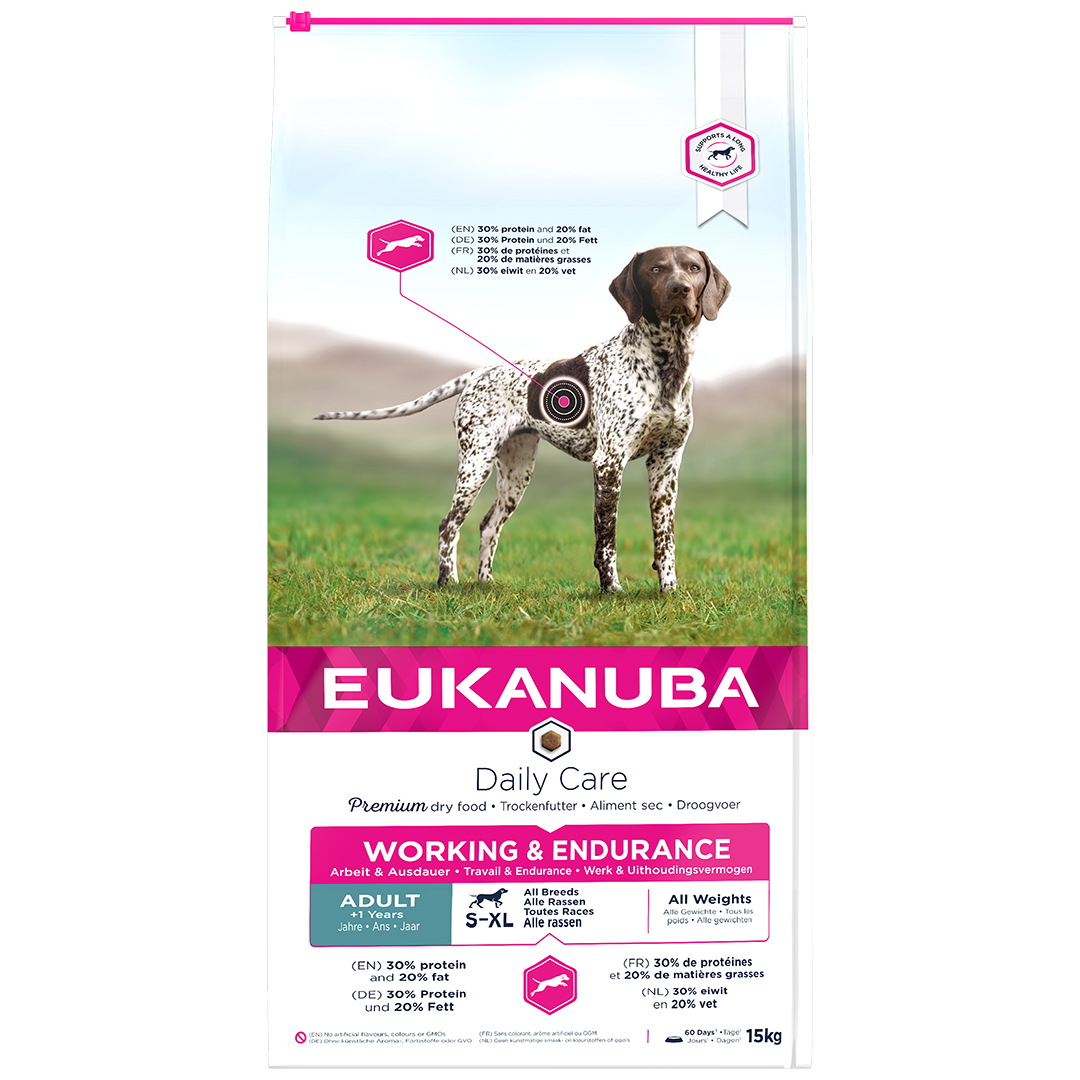 EUKANUBA Daily Care Working & Endurance voor werkhonden met veel energie en een grote behoefte aan voedingsstoffen, voor een langdurige energie & piekprestaties. Het hoge eiwitgehalte (30%) en vet(20%) ondersteunt zeer actieve, werkende honden en verbeteren hun uithoudingsvermogen. De aanvullende Omega 3 en 6 ondersteunen het reukvermogen van uw hond. Dit droogvoer wordt tevens aanbevolen voor drachtige of zogende teefjes. De speciale zeshoekige brokvorm met de unieke DentaDefense helpen de tanden schoon en gezond te houden. Eukanuba Daily Care droogvoer voor werkende honden bevat verse kip ter ondersteuning van vetvrije spieren. Dit voedsel is 100% compleet en uitgebalanceerd en is ideaal voor volwassen honden van alle rassen.