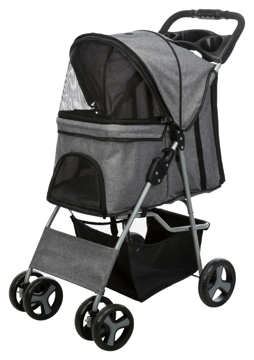 Grote openingen, om gemakkelijk in en uit te kunnen stappen/tillen. Diverse scheur en bijtvaste gaas-inzetstukjes voor voldoende ventilatie en goed zicht, deels afdekbaar. Dankzij de ritssluiting deels of geheel afsluitbaar. 2 Korthouders voorkomen dat het dier eruit kan springen. Uitneembaar kussen, bekleding afneembaar met vochtige doekje. Inclusief gevoerde duwstang, fleshouder en boodschappenmandje (Bakmaat: 55 x 53 x (H) 33 cm)