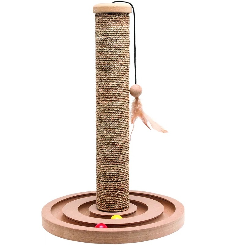 Krabben en spelen. Op de voet van deze krabpaal kan je kat spelen met de balletjes die er niet uit kunnen en vrij kunnen rollen. De krabpaal is bekleed met zeegras(water hyacinth) Aan de bovenkant is nog een extra speeltje aan een elastiek gemaakt voor nog meer speel plezier.