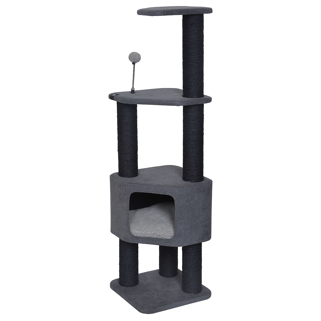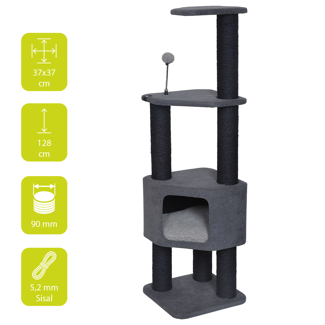 Katten hebben een kwaliteitsvolle krabpaal nodig om hun nagels te scherpen en hun territorium af te bakenen. Sisal is een natuurlijke en zeer sterke vezel die de kat helpt om de schilferige bovenste laag van de nagels te verwijderen. Dat voorkomt dat de nagels ingroeien. Daarom is een krabpaal een must voor elke kat! De ‘Kobe’-kattenboom van EBI is een Nederlands ontwerp, geïnspireerd door het Japanse zen-concept. De esthetiek van deze paal geeft kalmte en minimalisme weer. Deze paal is bekleed met een zachte interieurstof en past dan ook uitstekend in elk interieur. Deze paal bevat een hoge hoekgrot met een kussen in teddy-vacht waar uw kat uiterst comfortabel kan slapen. Boven de grot hebben wij 2 platformen aangebracht zodat uw kat zijn behoefte om te klimmen kan botvieren en zijn perfecte uitkijkplaatsje kan vinden. In beide platformen zit er mousse onder de interieurstof. Daardoor zal deze paal het favoriete luilekkerplaatsje voor uw kat zijn. En het speeltje aan een springveer zorgt voor extra pret.