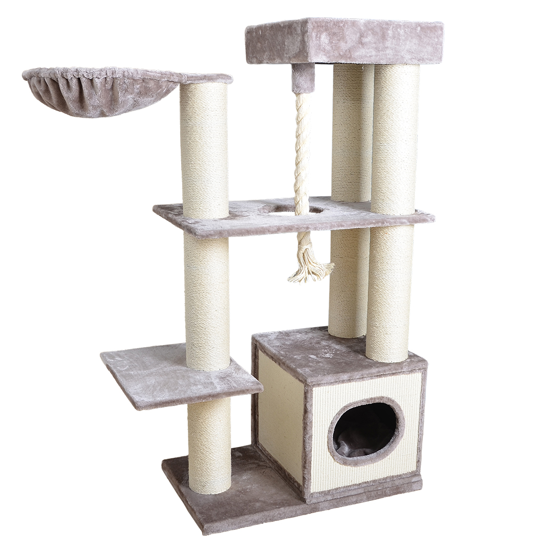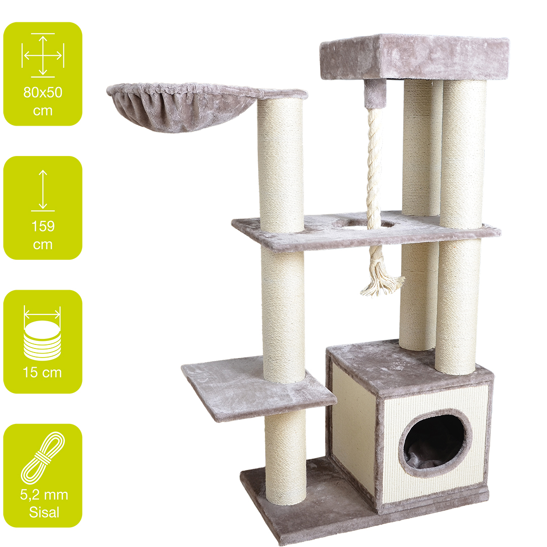 De EBI krabpaal Leicester is een pluche krabpaal van 159 cm hoog dat staat als een huis. Zijn brede opstelling, bestaande uit brede krabstammen van maar liefst 15 cm dik, maakt het geheel super stabiel. De krabpaal heeft alles wat een kattenhart begeert: een stevige ondergrond, brede sisal palen, een comfortabel schuilhuisje met uitneembaar kussentje, een hoge hangmat, een hoge ligmand en een extra dik speeltouw. Deze krabpaal is geschikt voor grote en actieve katten of gezinnen met meerdere katten.