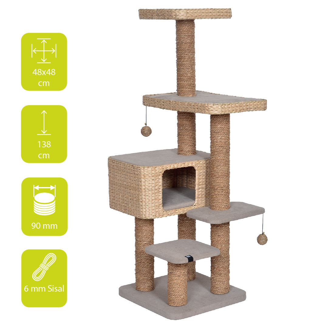 De ‘Palawan’-kattenboom is een eigen EBI ontwerp en zal je kat veel plezier bieden door zijn 4 verdiepingen met alles op en eraan. De krabpaal is grotendeels bekleed met onbewerkte waterhyacint, super sterk en scheurvast. De ligoppervlaktes zijn bekleed met een zachte interieurstof waardoor deze krabpaal uitstekend past in elk interieur. De 2 bengelende speeltjes die aan deze krabpaal bevestigd zijn, nodigen je kat uit om te spelen. Maar tevens kan je kat ook heerlijk relaxen op één van de ligplaatsen met comfortabele en ergonomische foam kussens of een dutje doen in het kattenhuis. Voor katten is een degelijk krabmeubel noodzakelijk voor het verzorgen van hun nagels en het afbakenen van hun territorium. De 6mm waterhyacint rond de 9cm dikke palen is een natuurlijk en zeer robuust materiaal die de kat helpt de schilferige bovenste laag van de nagels te verwijderen.