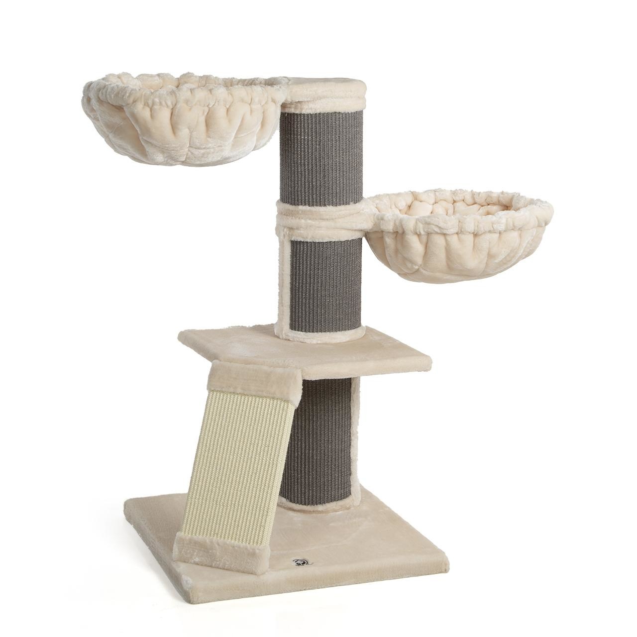 Grote krabpaal speciaal voor de grote kattenrassen. De krabpaal heeft twee grote hangmatten met stalen frame, met een diameter van ca. 45 cm en een liggedeelte nodigen uit om te dutten en te ontspannen. De 20 cm dikke stammen omwikkeld met sisaltapijt en een krabplank dagen je kat uit om zijn klauwen te slijpen. De grote voetplaat in combinatie met de massieve kolommen zorgt voor een stevige stand.