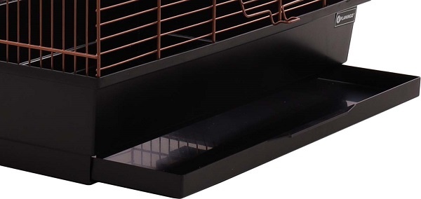 Vogelkooi met tralies in koper kleur. Inclusief 2 zitstokken en 2 grote eet/drinkbakjes. 2 Deuren aan de voorzijde. Met uitschuifbare onderlade om de kooi snel te reinigen.