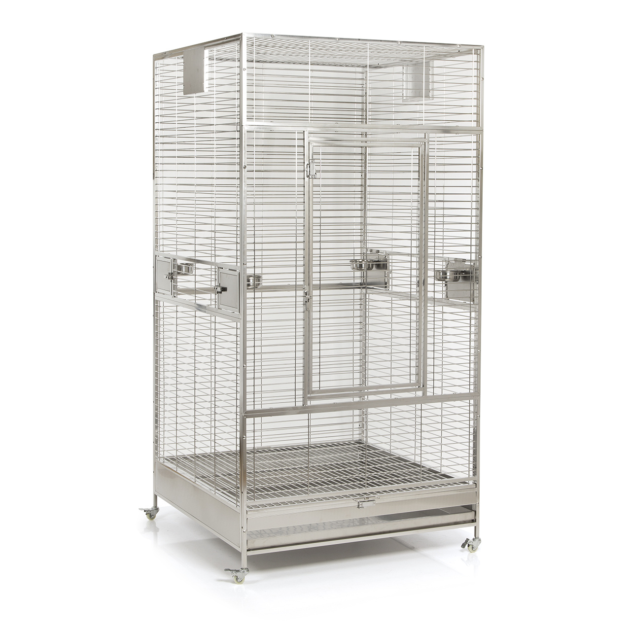 De roestvrijstalen kooi van Montana, het kleine broertje van de Arkansas II. Uiteraard zijn bij de levering RVS bakken, zitstok, uitneembaar bodemrooster en stabiele zwenkwielen inbegrepen. De Arkansas I heeft ook vier zijdeuren en een “broeddeur” voor het bevestigen van een broedmachine! De grote voordeur is ideaal om je grote papegaai in of uit de kooi te halen.