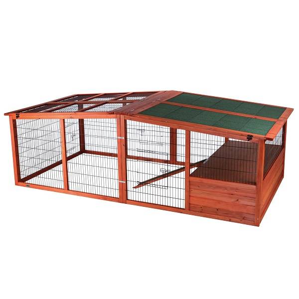 Grote buitenren van gebeitst vurenhout met dak. Stevig metalen traliewerk, het dak voorkomt dat je konijn eruit sprint, en geeft bescherming tegen roofvogels en katten. Grote extra verdieping met weerbestendige schuilplaats, inclusief loopplank. Deze grote ren beschikt over 3 ruime toegangsdeuren. Dakdelen apart van elkaar van bovenaf te openen (de ene helft als bescherming tegen zon/regen gesloten) Haken voorkomen dat het dak open klapt als er bijv. een harde wind staat.