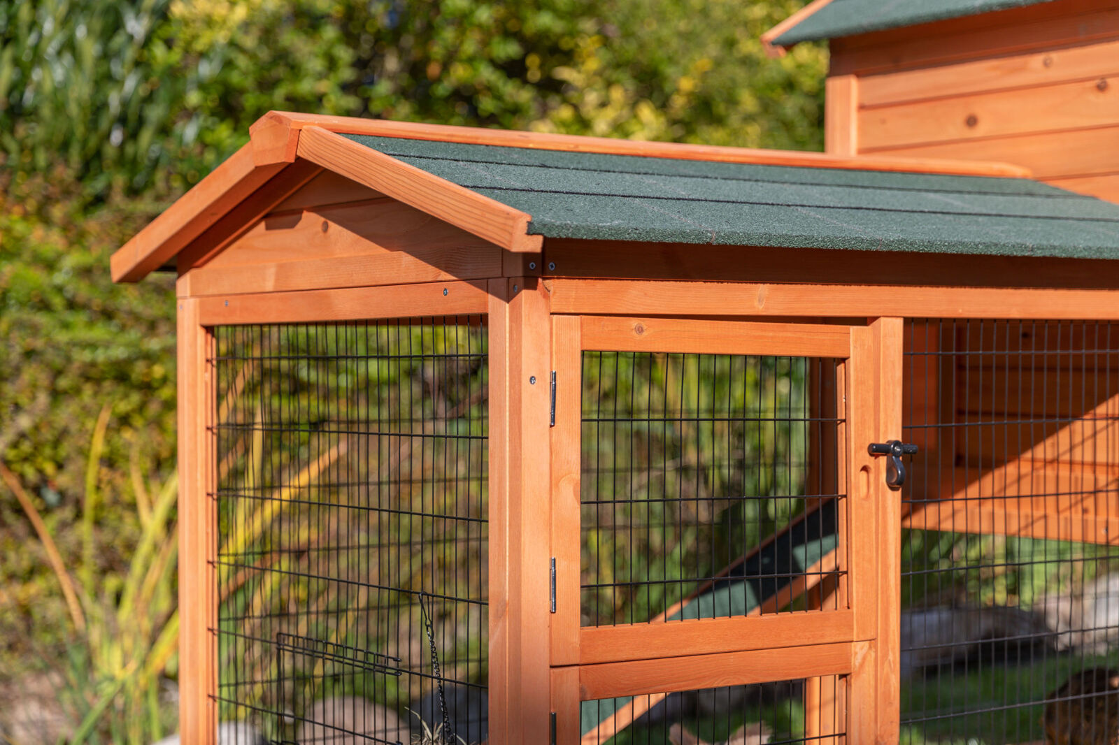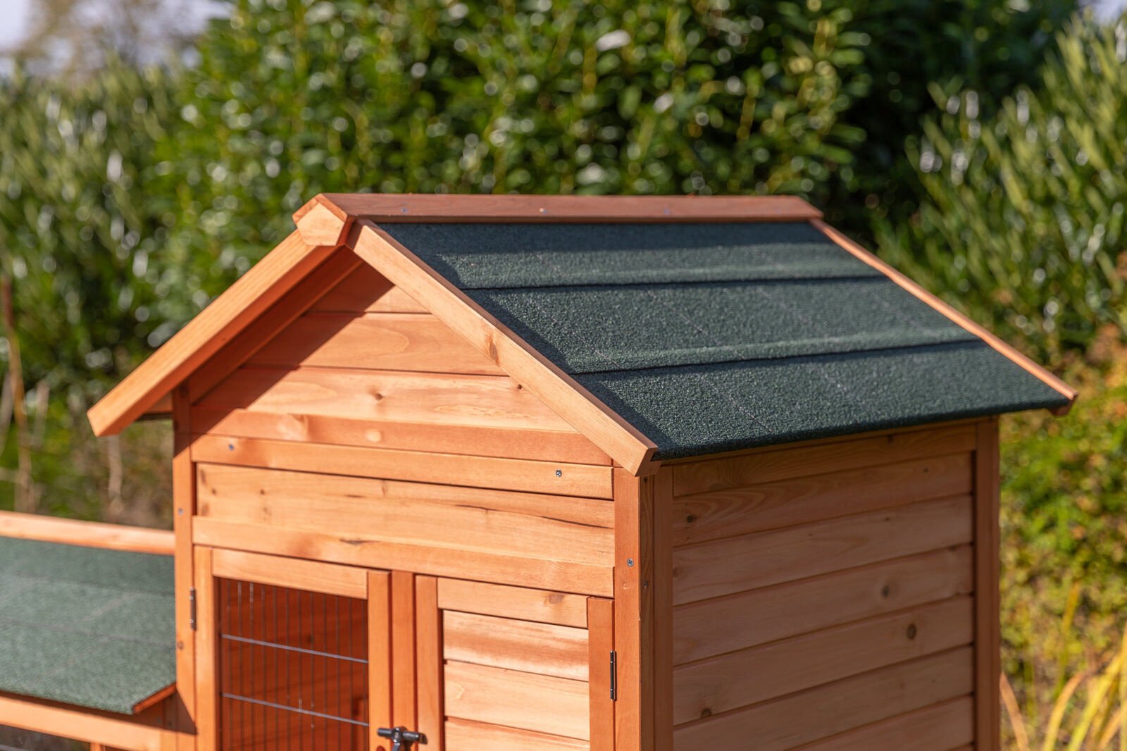 Hoog kwaliteit konijnenhok met groot nachthok. Het konijnenhok heeft maar liefst 6 toegangsdeuren en een water dicht bitumen dak welke geopend kan worden. Het nachthok is voorzien van een kunststof lade. Alle sluitingen en schroeven zijn van RVS. Het gaas heeft een zwarte poedercoating.