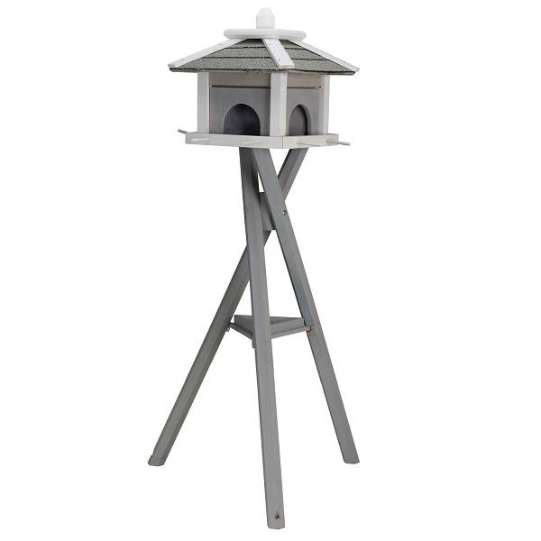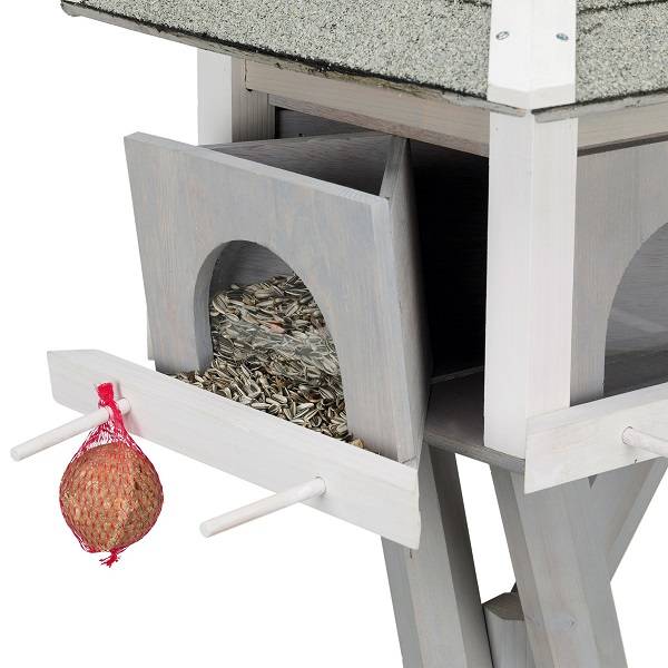 Groot luxe voederhuis met 4 aparte compartimenten waar je voer schoon en droog in kan plaatsen. Met ruim 8 landingsplaatsen is deze voederhuis geschikt voor meerdere vogels, de zitstokken kan je ook gebruiken om mezenbollen aan te hangen. Er is een extra voedertafel voor vogels die hun voer laag bij de grond zoeken. Gemaakt van gebeitst vurenhout met bitumen dak.