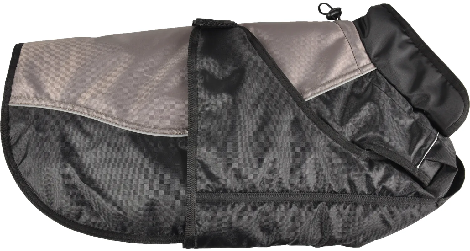 Ademende polyester met katoen aan de binnenkant. Mag in de wasmachine op max 30 graden. Het hondenjas is waterbestendig en winddicht. Afgewerkt met een PU polyurethaan coating en reflecterende strepen. Met borst- en buikdekking en opstaande kraag voor betere bescherming. Heeft elastieken voor de achterpoten en een opening voor de leiband. Buikriem met klittenband.